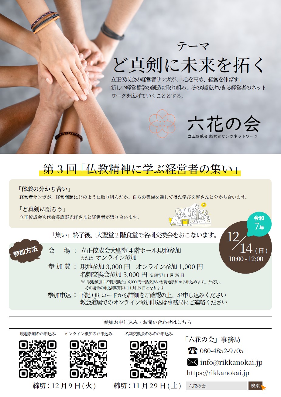 2025 09.16 第3回「仏教精神に学ぶ経営者の集い」電子チラシ お知らせ Tweet クリックで開く 関連記事 第3回「仏教精神に学ぶ経営者の集い」参加申込受付中… 【サンガネットワークNo.2】「技術力は、職人技の… 各地域から「塾」開催の報告北陸・四国・北海道・神奈… 【サンガネットワークNo.1】「災害弱者を守ります… 令和7年3月22日、佼成図書館視聴覚ホールにて、東… 令和7年4月13日午前、南九州支教区「六花の会」が… 「六花の会」紹介小冊子のデジタル版が完成しました。… 第15回「オン塾」実施報告 南九州支教区 「六花の会」学習会 報告